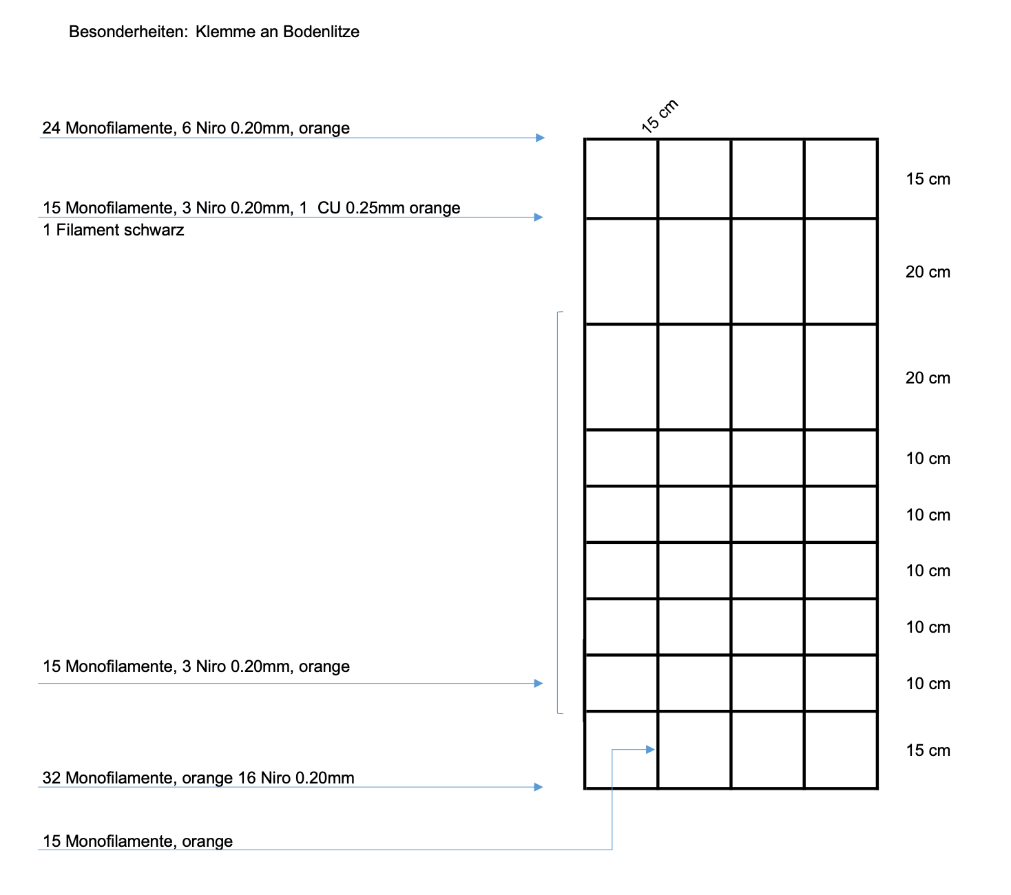 • Bodenlitze: 32 Kunststoffmonofile Ø 0,40 mm, verstärkt, nicht stromführend, Widerstand 70 Ohm