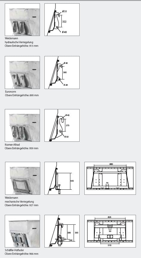Für eine optimale Anpassung an verschiedene Hof- und Frontladersysteme stehen sechs werksseitige Aufnahmeplatten zur Verfügung: