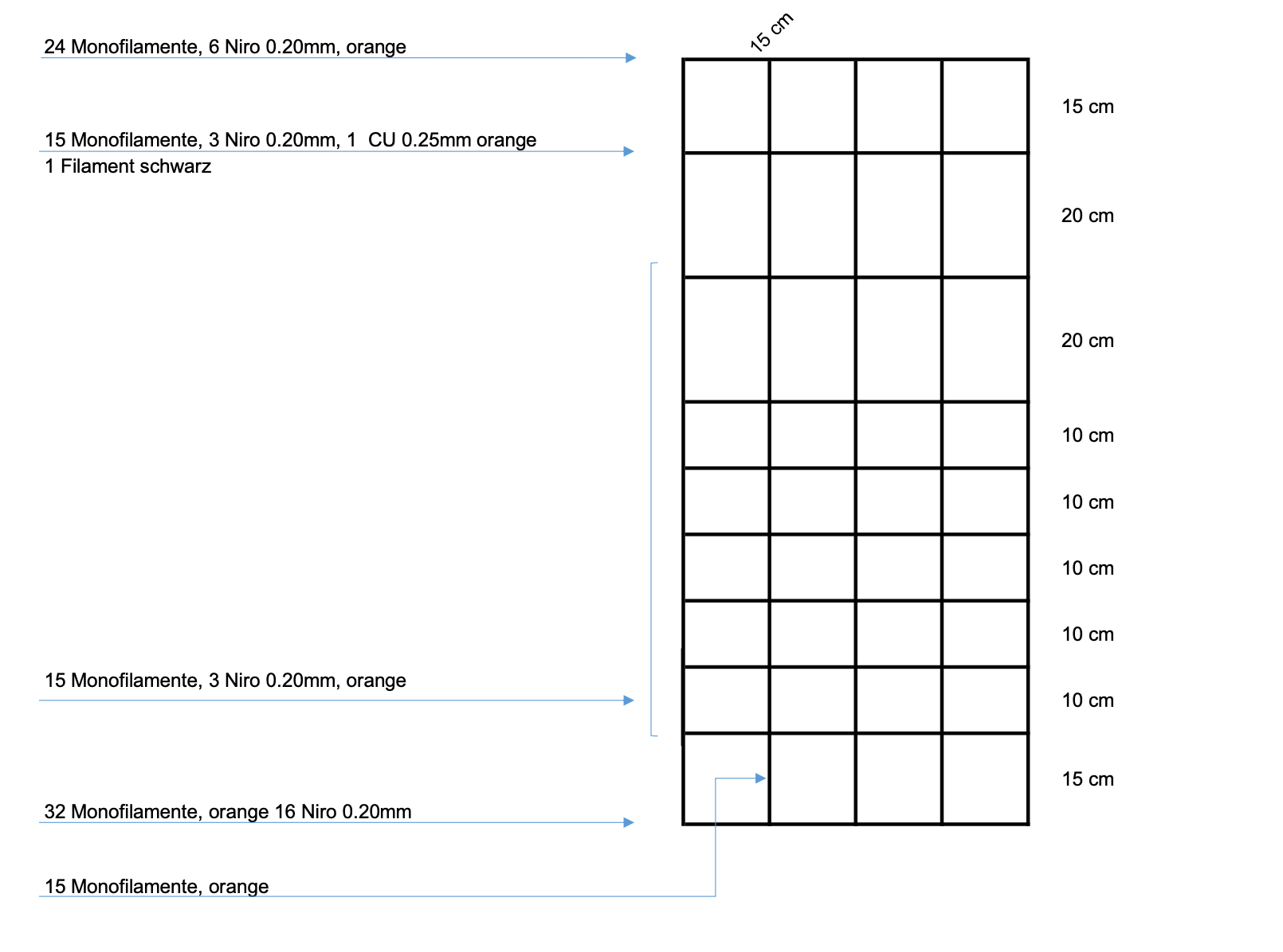Senkrechte Litzen: je 15 Kunststoffmonofile Ø 0,40 mm