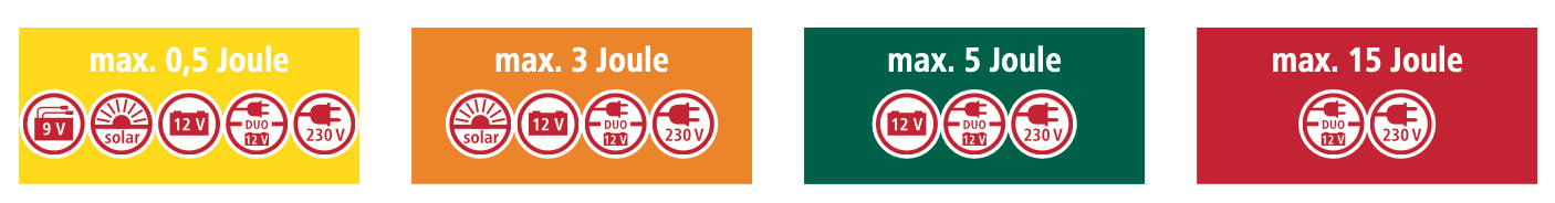 Wählen Sie entlang der X-Achse Ihre Zaunlänge und entlang der Y-Achse Ihre Tierarzt bzw. den Bewuchs. Im Schnittpunkt können Sie die mindestens benötigt Joule-Leistung sowie die möglichen Gerätefamilien ablesen.